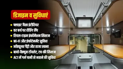 ट्रेन के इंटीरियर डिजाइन को इस तरह बनाया गया है कि यात्री को फ्लाइट और मॉडर्न होटल जैसा आराम मिले. हर बर्थ के लिए USB रीडिंग लैंप दिया गया है, जिससे रात में बिना किसी को परेशान किए पढ़ा जा सकता है. रियल-टाइम पैसेंजर इंफॉर्मेशन सिस्टम के जरिए ट्रेन की लोकेशन, अगला स्टेशन और अन्य जरूरी जानकारी स्क्रीन और ऑडियो के जरिए मिलती रहेगी. सफर के दौरान Wi-Fi और इंफोटेनमेंट की सुविधा भी मौजूद रहेगी. ताजा खाना देने के लिए इसमें मॉड्यूलर पैंट्री बनाई गई है।